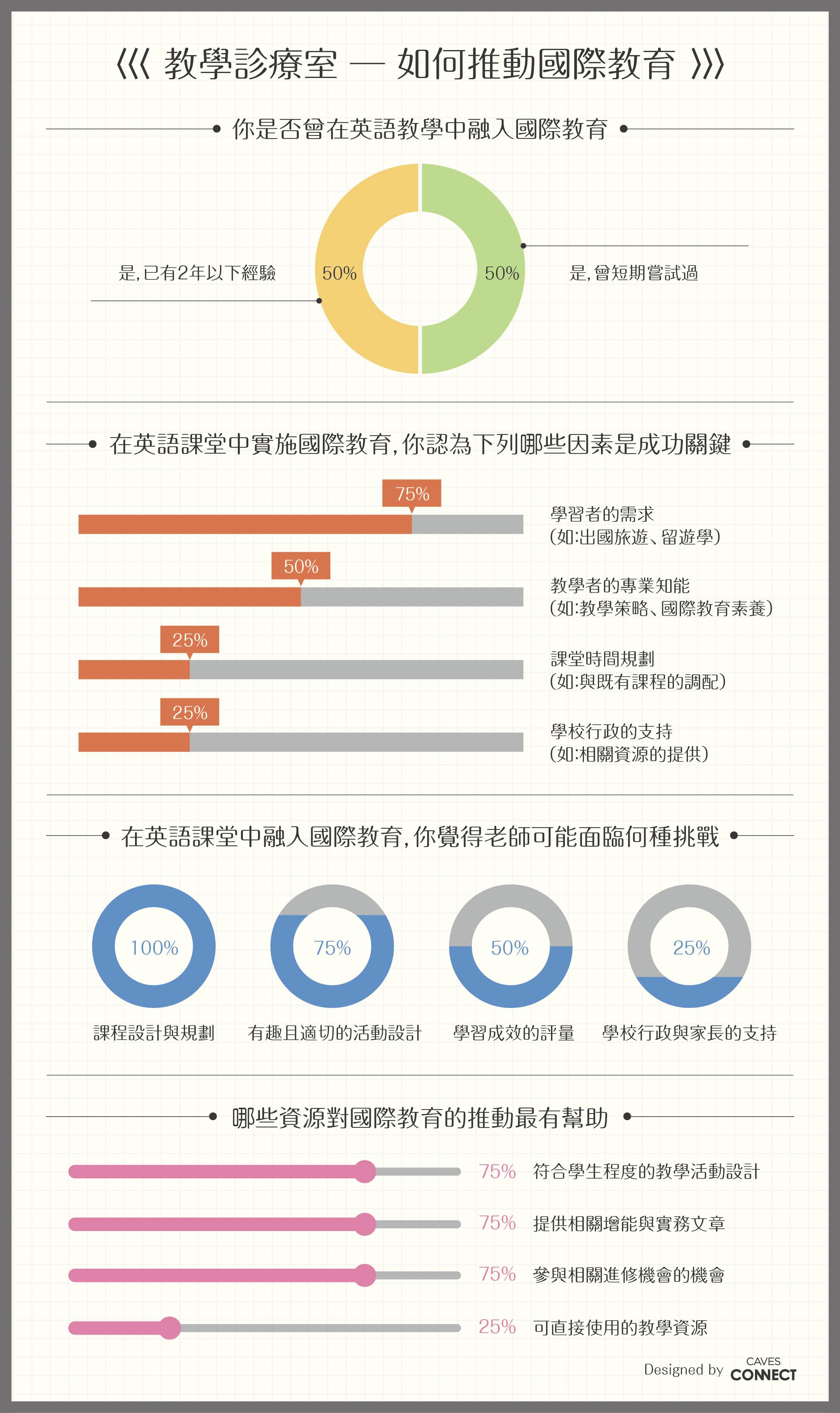 隨著網路資訊的發展,國際間地域性、文化上的交流有著不同以往的發展。在如此全球脈動快速變化的時代,教師們是否也能透過教育,帶領學生跟上國際的腳步,拓展更寬廣的視野呢?