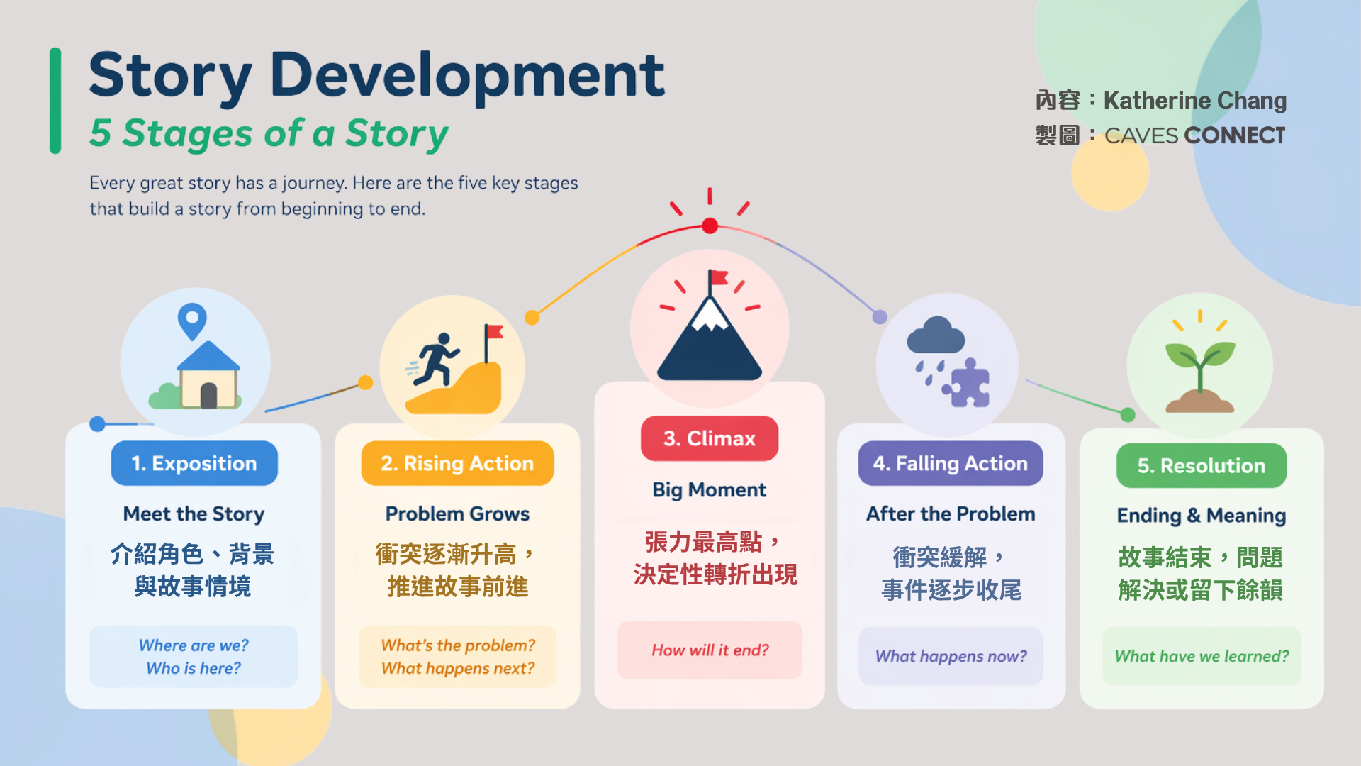 初期建議引導學生注意三大核心元素:character(角色)、setting(背景)、plot(情節)。他們會逐漸發現,故事的發展來自作者的精心安排與鋪陳,更能依此初步建立讀者的預測能力。下圖為常見的故事發展結構: