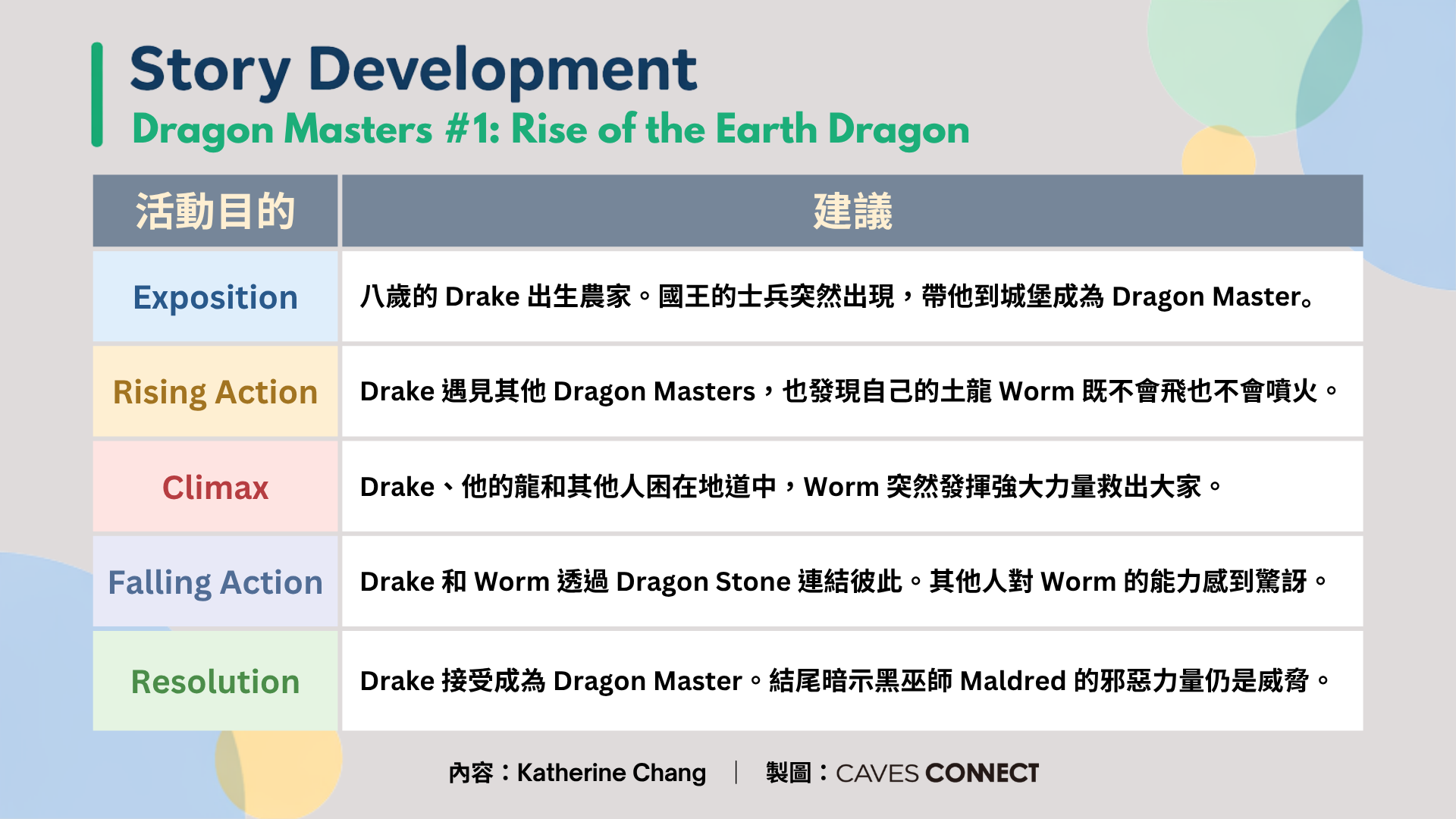 課堂中可帶學生觀察故事是如何逐步發展,並在閱讀後進行口頭重述或者練習寫成摘要。以下以 Dragon Masters #1: Rise of the Earth Dragon 為示範: