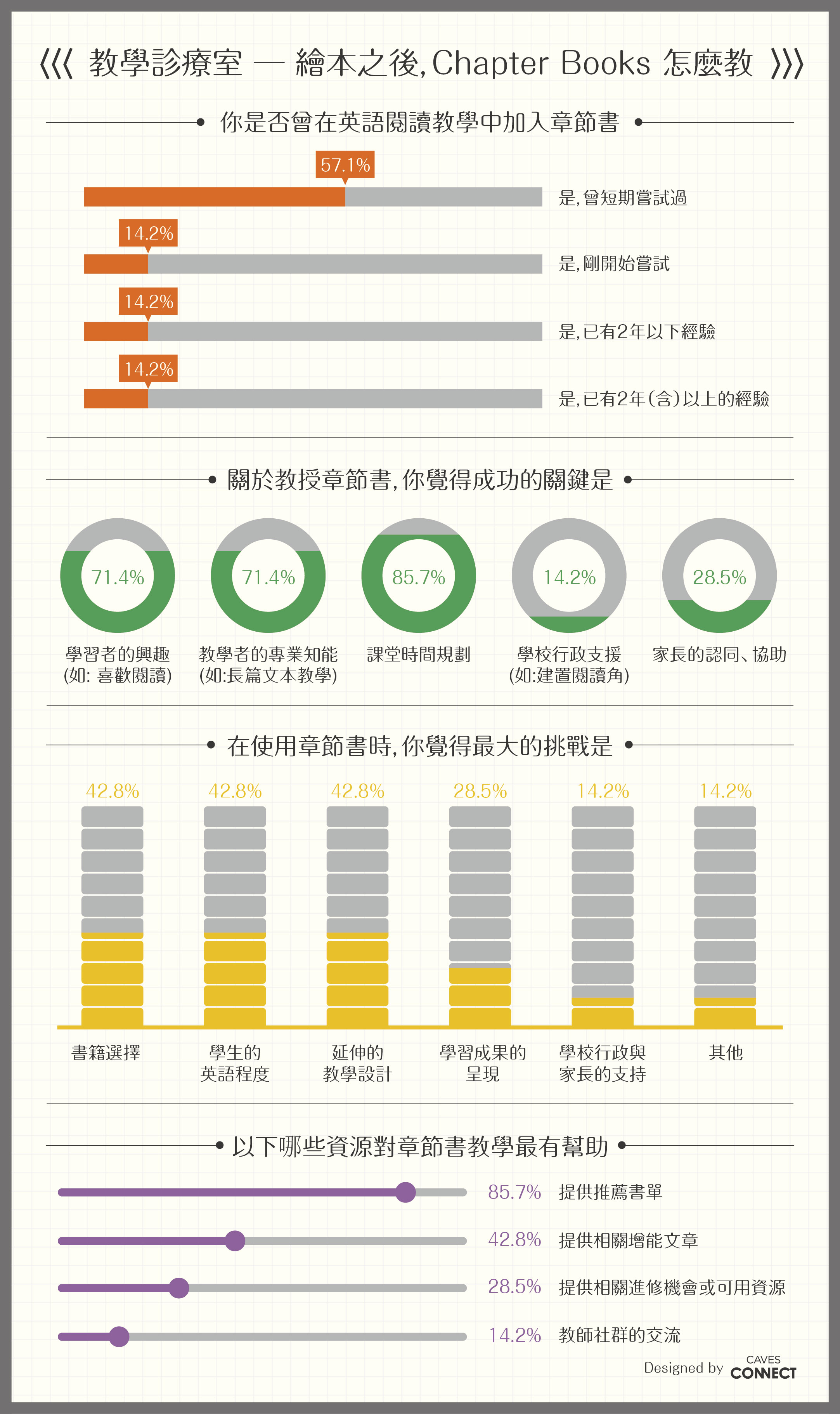 此次【教學診療室】邀請到銘傳大學講師 Katherine Chang,分享章節書的引導策略,帶你重新認識英語進階閱讀教學的關鍵。在進入精彩內容前,先來看看本期的動指小調查:
