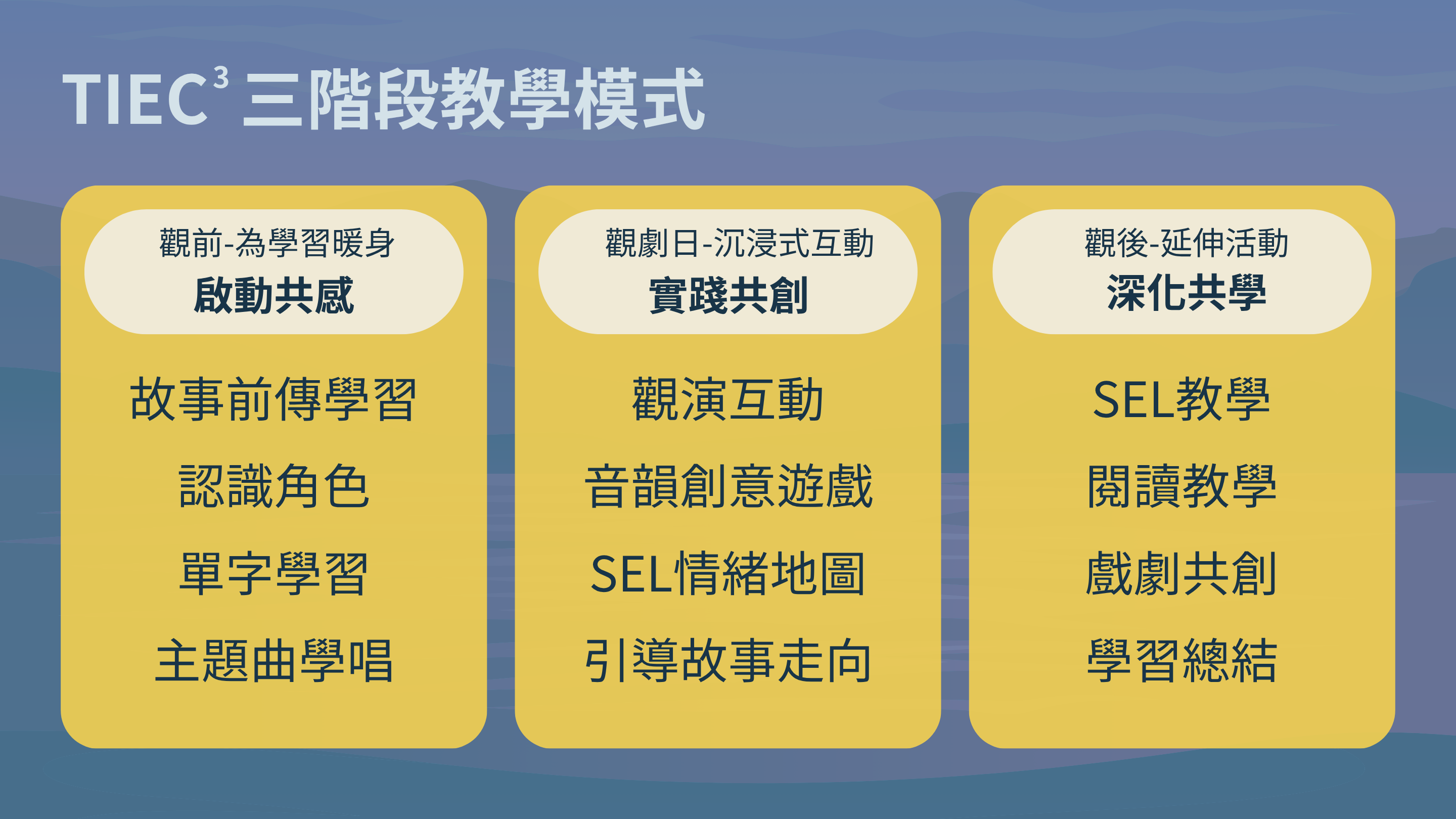 敦煌教育集團將起源於 1960 年代英國的 TIE(Theatre in Education) 重新調整並升級為 TIEC³(Theatre in Education for Communication, Competency and Creativity)。