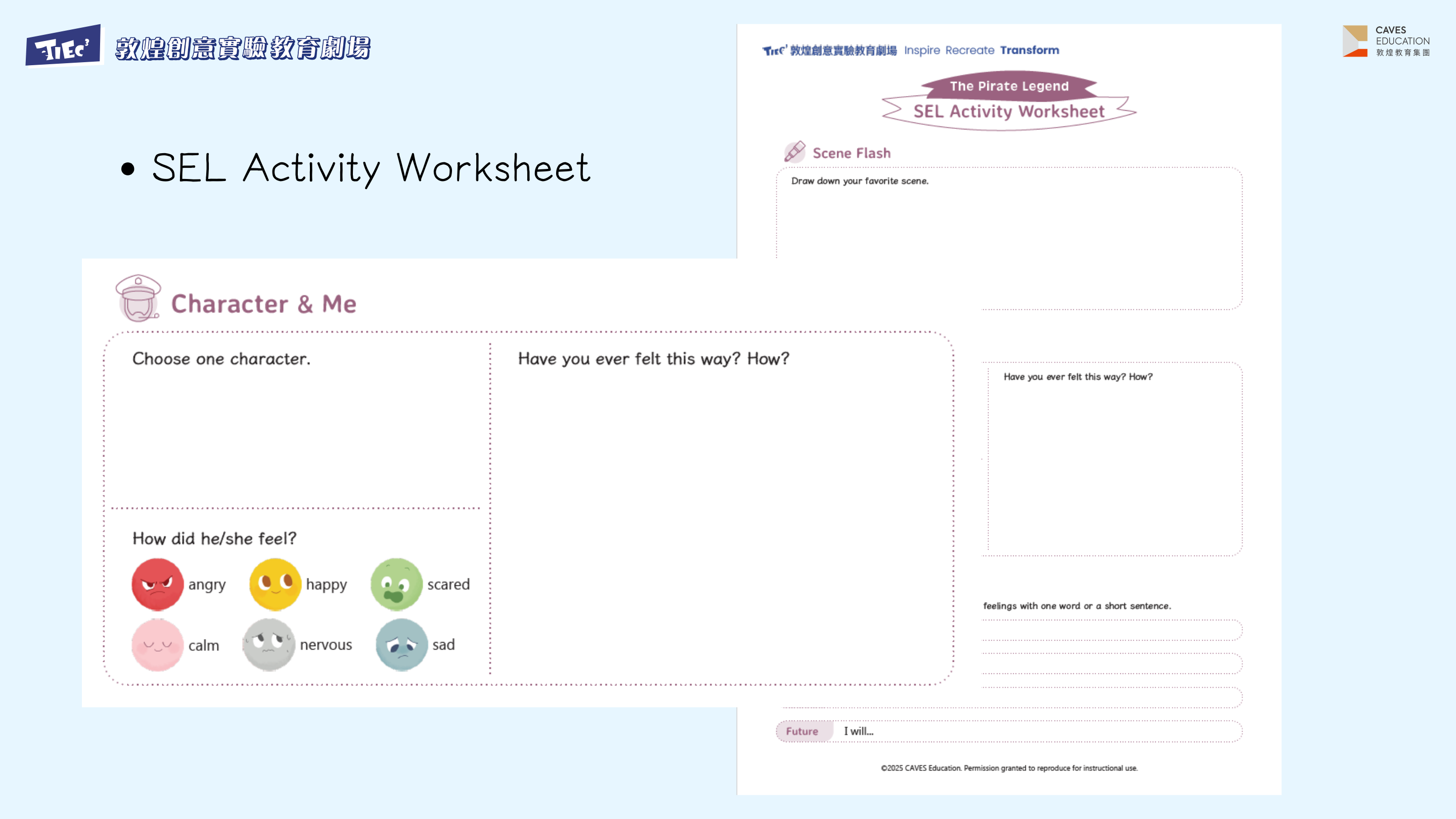 觀劇當天,演員使用「情緒地圖」引導學生剖析角色情緒(SEL 實踐),並邀請觀眾上台分享感受與情緒解方。教師也可在觀劇後根據 SEL 繪讀本延伸教學,強化孩子對劇中主題與情感的理解。