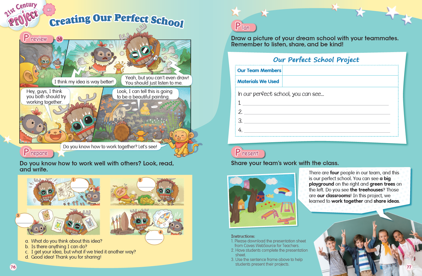 教學上建議讓學生有機會結合自身經驗,再進一步延伸思考與表達。比如在透過圖像、簡短文字與句型理解後,請他們說明對核心主體(如上圖一右頁的「perfect school」)的想法,並回顧創造的歷程。